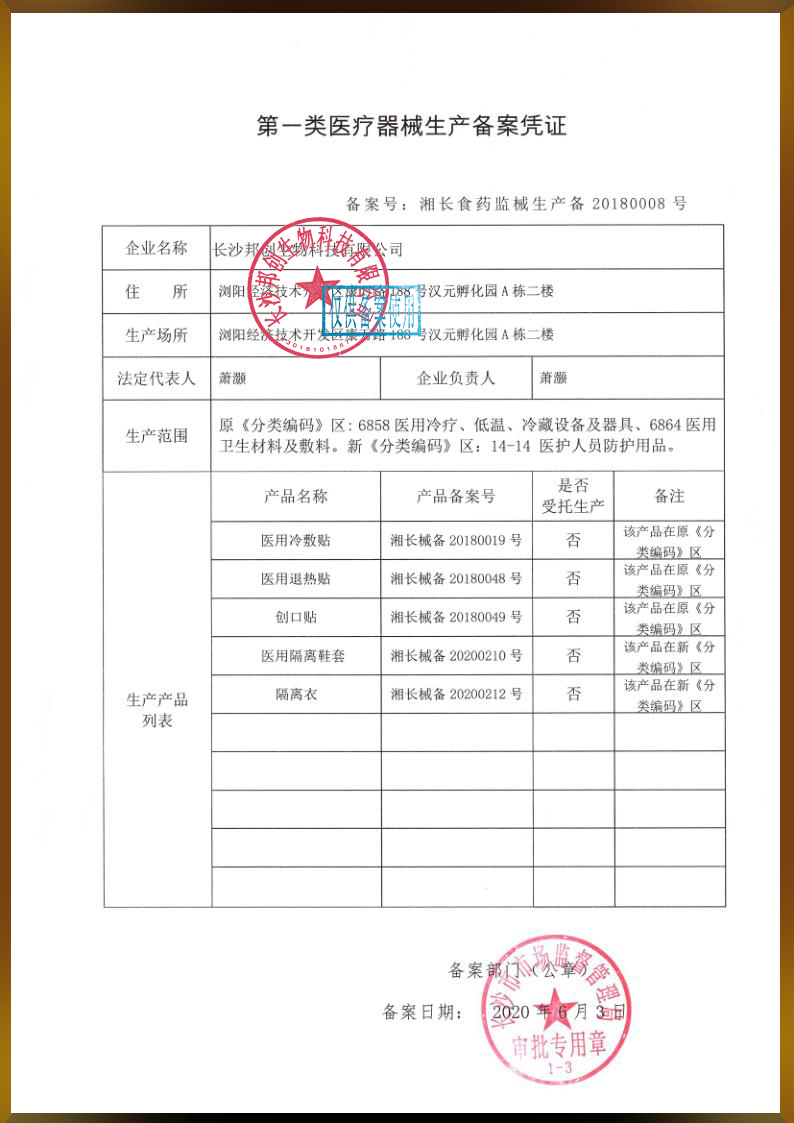 第一類醫(yī)療器械生產(chǎn)備案憑證