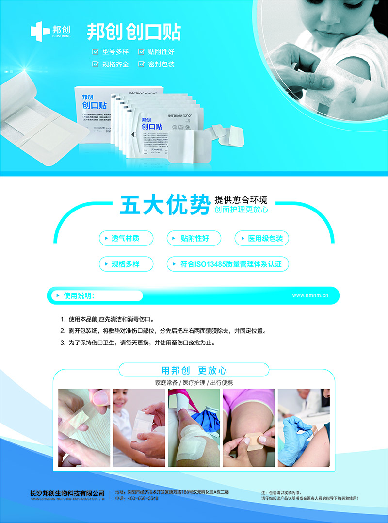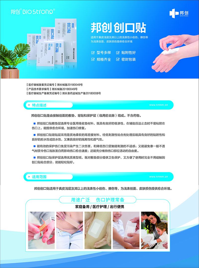 邦創(chuàng)創(chuàng)可貼,多規(guī)格可選,醫(yī)用級(jí),貼附性好,密封獨(dú)立包裝 。邦創(chuàng)創(chuàng)口貼適用于真皮淺層及其以上的淺表性小創(chuàng)傷、擦傷等,為淺表創(chuàng)面、皮膚損傷提供愈合環(huán)境。適合各類門急診等醫(yī)用場(chǎng)景和家居旅行備用。